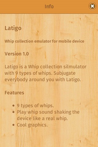 9 in 1 whip simulator for mobile devices. Latigo is a Whip simulator with 9 types of whips. Subjugate everybody around you with Latigo.