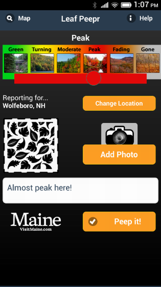 Find and report on fall foliage! Yankee Magazine's Leaf Peepr app helps fall-foliage fans find and report on the best and brightest colors in the United States. Make foliage reports (we call them Peeps!) by posting photos, writing comments, and rating foliage status for your location. The Peak Slider lets you rate foliage as either Green, Turning, Moderate, Peak, Fading, or Gone. The current foliage color is determined by averaging other ratings in a geographic area along with your Peeps. Use the Foliage Map to find current foliage rated by hundreds of other leaf peepers.
