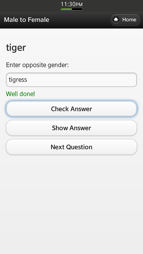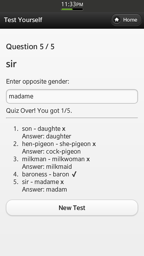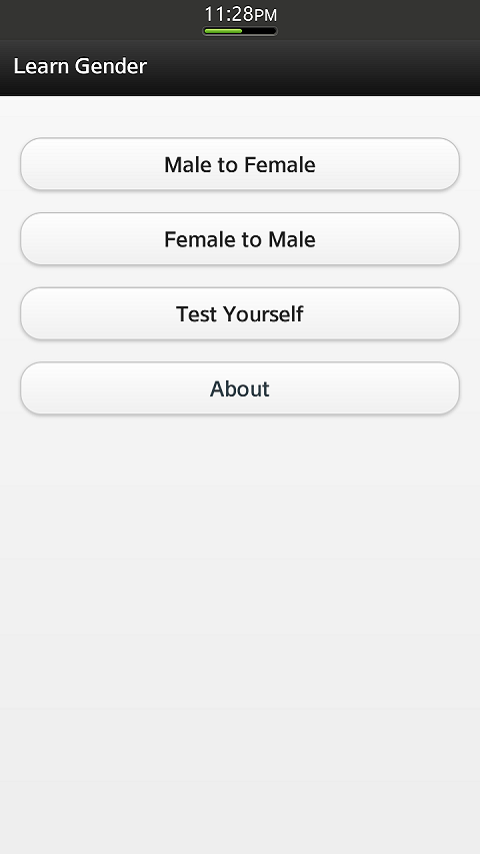 This app allows you learn Gender in the English language. It supports 2 modes (Masculine to Feminine and Feminine to Masculine). You can also use the Test mode for a random test of 5 Gender nouns.