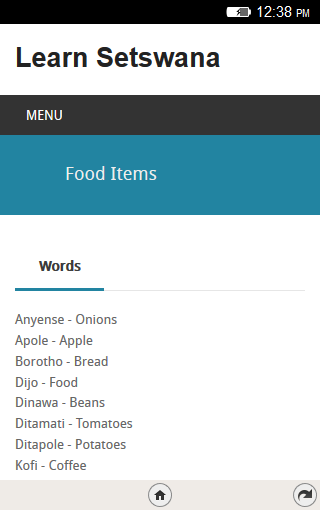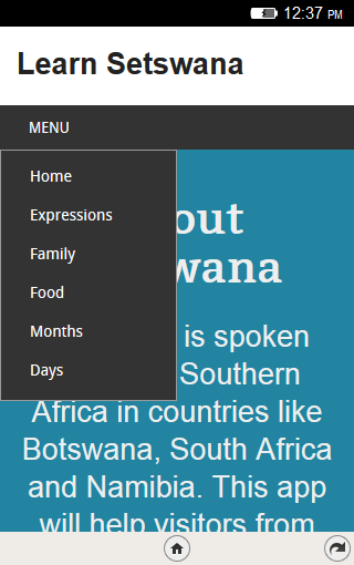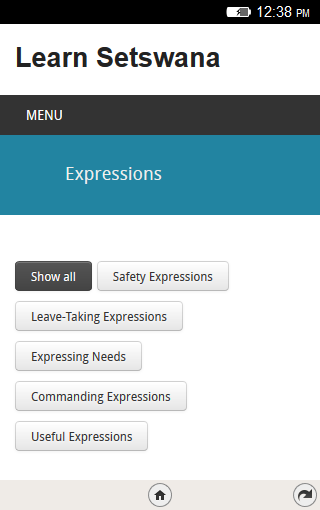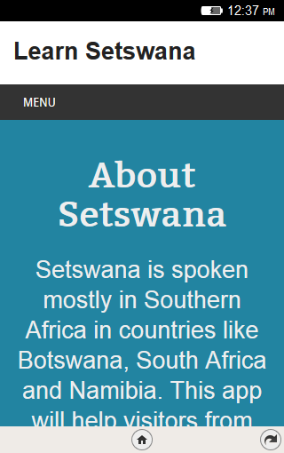 Setswana is spoken mostly in Southern Africa in countries like Botswana, South Africa and Namibia. This app will help visitors from outside Botswana to communicate with the segment of the Botswana population that speak less English or do not know English at all.