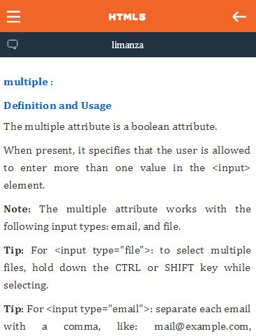 learn html5 app in persian language! for free!The first practical application HTML 5 with image and outputs that you can see in this application.! Limanza is one of the largest groups providing training in the application, the goal of designing these applications are fully trained and comfortable with the early stages of such operation. ،In this application we comprehensively teaches how to work with this language. The features of this program are as follows: - Check all html tags and html 5 - Practical examples for each segment - Attractive design - In-app search feature - No need for internet