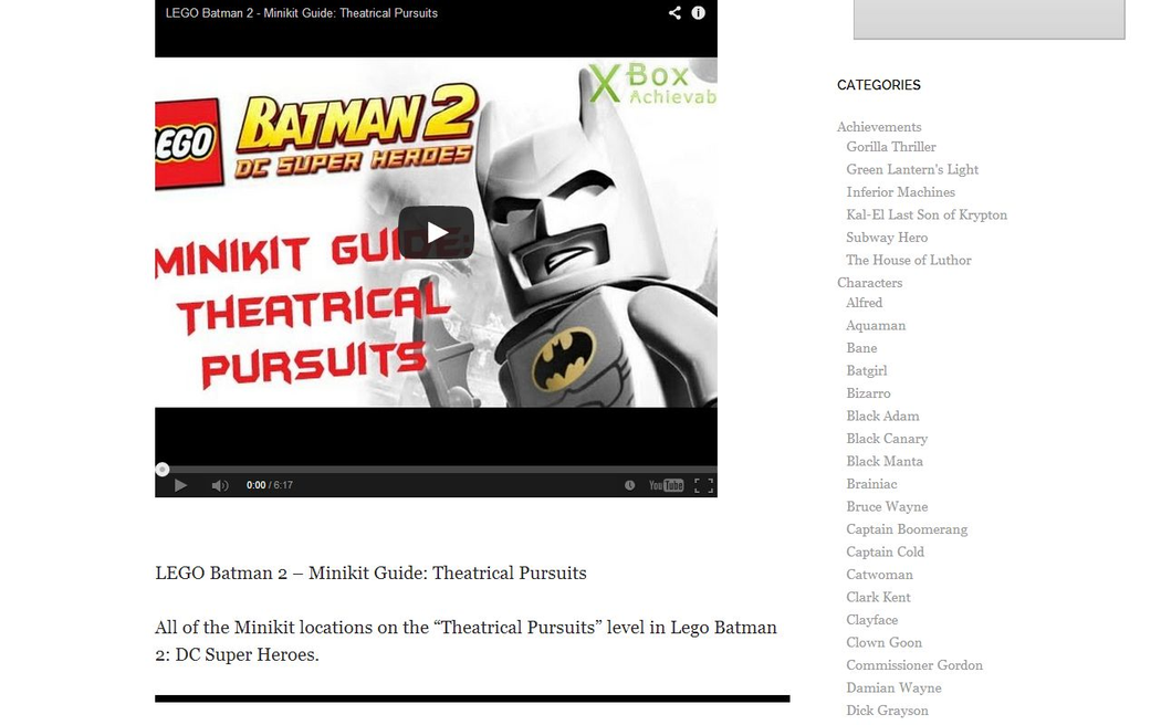 Complete Walkthroughs and Guides for LEGO Batman 2: DC Super Heroes on Xbox 360/PS3/WiiU/Wii/3DS/NDS/PS Vita Walkthroughs for all Missions: Theatrical Pursuits Harboring a Criminal Arkham Asylum Antics Asylum Assignment Chemical Crisis Chemical Signature Unwelcome Guests Destination Metropolis Research and Development Down to Earth Underground Retreat The Next President Core Instability Tower Defiance Heroes Unite Guides to finding Collectibles: Minikits Red Bricks Gold Bricks Vehicles Guides to finding Characters: Alfred Aquaman Bane Batgirl Batman Bizarro Black Adam Black Canary Black Manta Braniac Bruce Wayne Captain Boomerang Captain Cold Catwoman Cheetah Clark Kent Clayface Clown Goon Commissioner Gordon Cyborg Damian Wayne Dick Grayson Flash General Zod Gorilla Grodd Green Lantern Harley Quinn Hawkgirl Hawkman Huntress Hush Joker Katana Killer Croc Killer Moth Lex Luthor Lexbot Lois Lane Mad Hatter Man-Bat Martian Manhunter Mime Goon Mr. Freeze Nightwing Penguin Poison Ivy Policeman Ra\\\'s Al Ghul Riddler Riddler Goon Robin Scarecrow Shazam Sinestro Supergirl Superman Two-Face Two-Face Goon Wonder Woman Vicki Vale Zatanna
