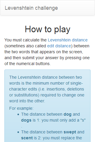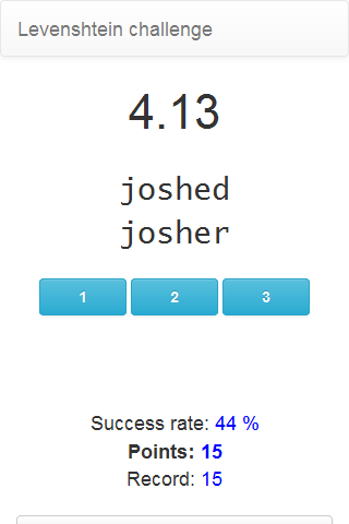 Levenshtein Challenge es un juego simple en el que tienes que calcular la distancia de edición entre dos palabras. El juego está disponible en Español, Francés e Inglés. Esta aplicación es software libre, ypuedes ver el código en: https://github.com/jfmdev/Levenshtein