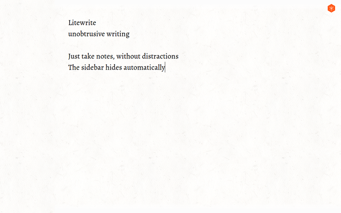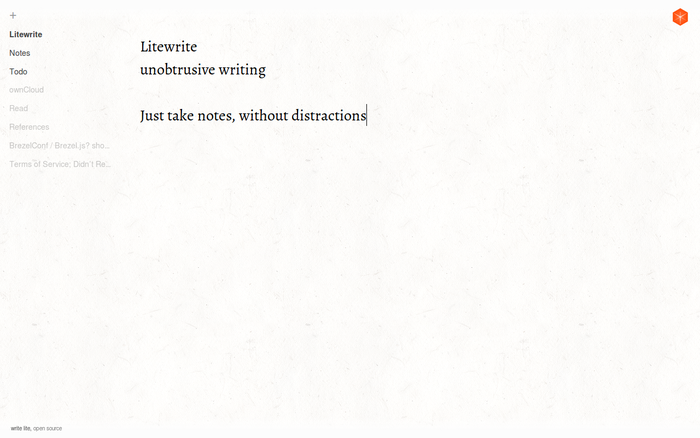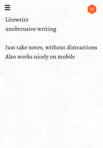 Litewrite simple notes! This is a distraction-free app designed for simple note taking and writing. It works offline and your browser will keep your data saved (nerd facts: AppCache & localStorage). You can also synchronize your notes to different devices using the open remoteStorage standard. Just check out the widget in the top right to get started. And Litewrite is open source, meaning you can help make it better! If you have any problems or suggestions let us know at http://github.com/litewrite/litewrite/issues Cool you’re here, hope you like it! Jorin & Jan-Christoph