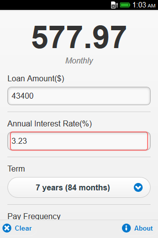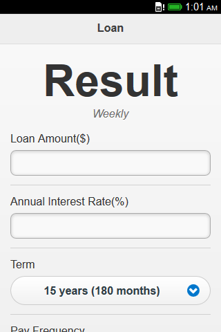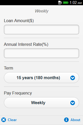 A simple loan calculator. To get the payment amount, simply input the loan amount, annual interest rate, amortization term and the pay frequency. Supports amortization term from six months to 25 years. Suports calculations for monthly, semi-monthly, bi-weekly and weeky pay frequencies Keywords: mortgage calculator, loan calculator, amortization calculator