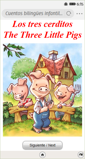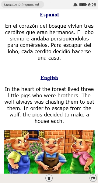 The classic tale The Three Little Pigs in 2 languages (Spanish / English) to learn English in an entertaining way. The app shows the top story in Spanish and in English translation in the bottom. Very entertaining and educational. They will be added shortly classic tales.