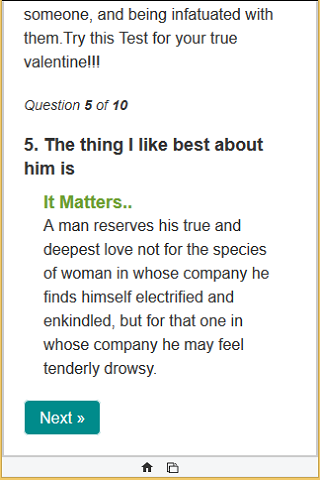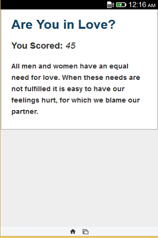 Youngsters find it difficult to state the difference between Love and Infatuation.This Application analyzes the user with a few Questions and Tell him whether he is truly in love with their best half or is it just Infactuation. Take Care Guys!!The calculations also depend on the time you run the App(Smiling).