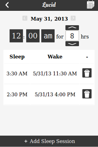 Sleep tracker to visualize your sleeping patterns over time. VERSION 1.0 - Record sleep sessions with the tap of a button - Manually enter sleep sessions in an easy-to-use, touch-friendly calendar view - View and delete your sleep sessions for individual dates - See a visualization charting your sleep for the past week, month, and all time Upcoming Features: - Different varieties of visualizations