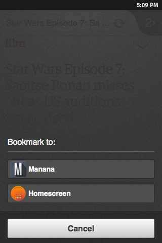 Enjoy the Web. Offline. Manana is a simple, bandwidth-saving way to enjoy your favourite articles without unnecessary distractions. You can read them anytime, tag and share them with your friends. How does it work? It's really simple: while browsing you just need to click on the bookmarking star, click on 'Add to Home Screen' and then choose Manana. The article is now ready to read later! Save it for tomorrow!