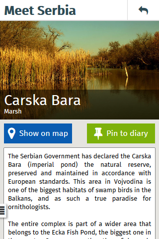 Meet Serbia is the perfect travel companion app if you are planning to visit Serbia. It is a great way to learn about Serbian nature, culture and monuments and plan your entire trip, city to city, so you can make sure that you never miss anything you should be seeing. Once you download Meet Serbia you get hundreds of sights within the app and the application will work even if your mobile device is not connected to the internet. Features: - view description and images of hundreds of sights and events in Serbia. - find closest sights and events. - plan your trip withing the app's diary. - filter sights by name or by city. - view location of a sight on Google Maps. - access all descriptions and images offline. - completely free.