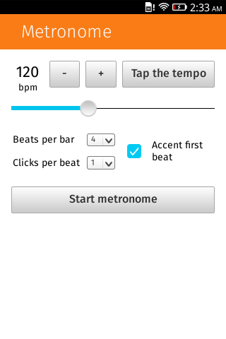 Mobile metronome with following features: - Tempo from 10 to 300 BPM - Tap tempo - Beats per bar - Clicks per beat - First beat accenting