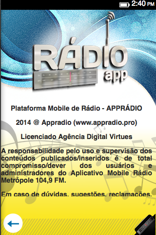 Radio FM No horizonte da comunicação nasce em Osvaldo Cruz em abril de 2011, Rádio Metrópole FM (104,9 mhz). Emissora de Rádio Comercial, transmitindo uma programação eclética com a qualidade e profissionalismo que você merece. Os estúdios da Metrópole FM estão localizados na rua Dr. Taves, número 500, no centro da cidade. Sua torre possui mais de 70 metros de altura e está instalada em um dos pontos mais alto da cidade, possibilitando emitir sinal para diversos municípios da Nova Alta Paulista. Seus equipamentos acompanham o progresso. A modernidade e o toque humano aliam tecnologia para transmitir informação e entretenimento para milhares de ouvintes. A união com seus clientes é uma parceria sacramentada pela credibilidade e confiança de quem não abre mão de ser empreendedor. Venha fazer parte você também desse time campeão Keywords Metrópole FM Osvaldo Cruz/SP, Rádio Metrópole FM , Rádio Metropole FM , rádio metrópole fm , radio metropole fm , Metrópole FM , Metropole FM , metropole fm ,metrópole fm , metropole , metrópole , radio brasileira , radio do brasil , aplicativo de musica , radio.