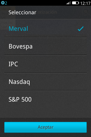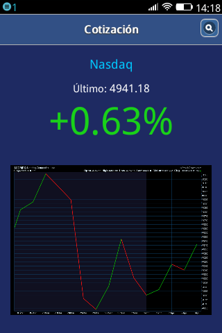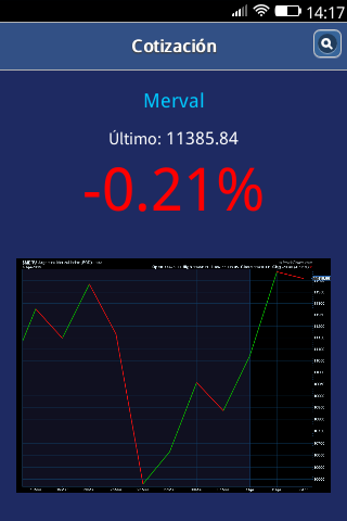 Cotización de Mercados Financieros. Muestra información sobre ultimo precio y porcentaje de cambio para algunos indices como: Merval, Bovespa, IPC, Nasdaq y S&P 500. Ademas permite ver un gráfico de la evolución en los ultimos 15 días, 1 mes y 3 meses.