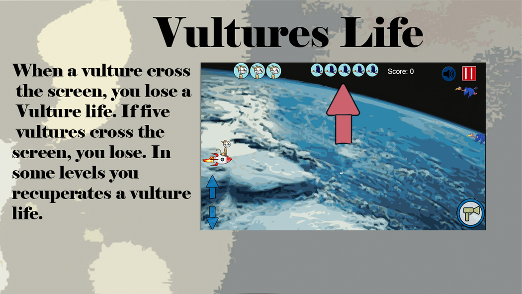 You are an intergalactic cat that has to figth with vultures. Use Up/Down keyboard arrow Keys to control to the character. Press Space bar to fire.