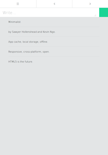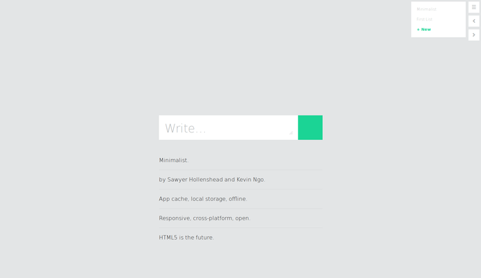 Create lists of thoughts you want to remember. VERSION 2.0 - Bug fixes - Edit and sort list items VERSION 1.0 - Create lists and navigate between them - Add, delete, or sort list items - Mobile, tablet, desktop optimized - Offline functionality using HTML5 client local storage and app cache