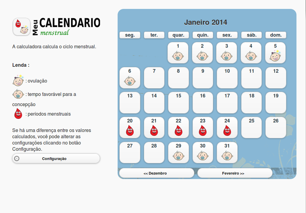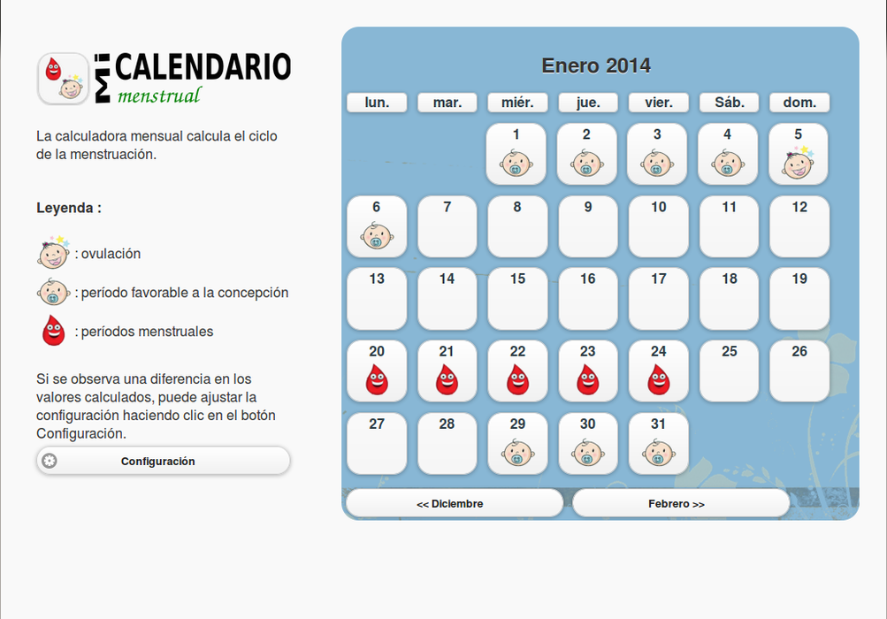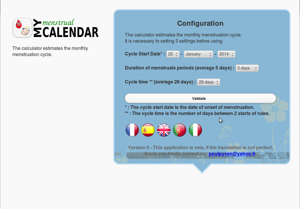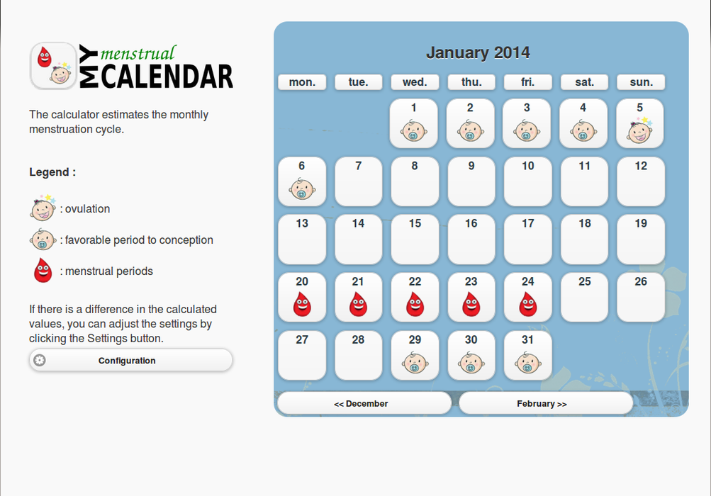 My menstrual calendar is simple and pleasant to use. The calculator only estimates the monthly menstruation cycle, but does it well.Couples who are expecting a child can find the good periods. It is also especially useful for those who want to plan a weekend getaway or a weekend of sports. Finally, it will be useful to men who want to offer an evening to his wife, mistress, concubine or other.