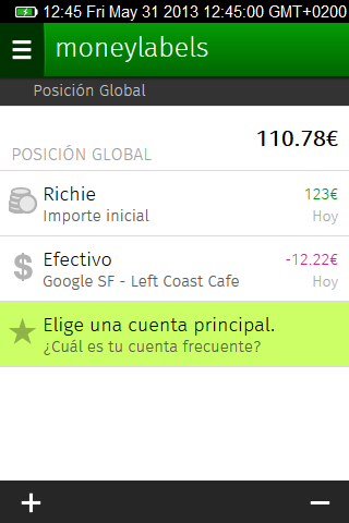 La aplicación que te permite etiquetar tus gastos. Con nuestra aplicación podrás llevar al día la contabilidad de tu hogar de una forma sencilla. Controla el gasto y los ingresos, etiquetando los movimientos de una forma fácil y dinámica. Más de 15 categorías para que puedas filtrar tus apuntes. Acabamos de integrar la localización de tus gastos gracias a Foursquare para un mayor control de los mismos. Crea y edita fácilmente todas las cuentas que quieras. Trabajamos ya para ofrecerte estadísticas de tus finanzas, algo que imaginamos, usarás mucho.
