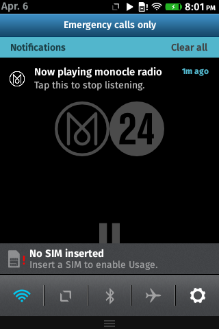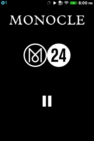 Listening to Monocle 24 Radio in style. This simple player for Monocle 24 radio allows you to listen to your favorite programs live. In contrast to the web page, it can run nicely in the background while you're doing other, perhaps more important stuff on your Firefox OS phone. It shows a helpful notification while playing that allows you to turn it off at any time. It's really that simple. Note that this app is a labor of love and is not an official Monocle application and it's not affiliated with the brand. The audio is coming right from the monocle.com web site. The app is free and the sources are available on github. Enjoy