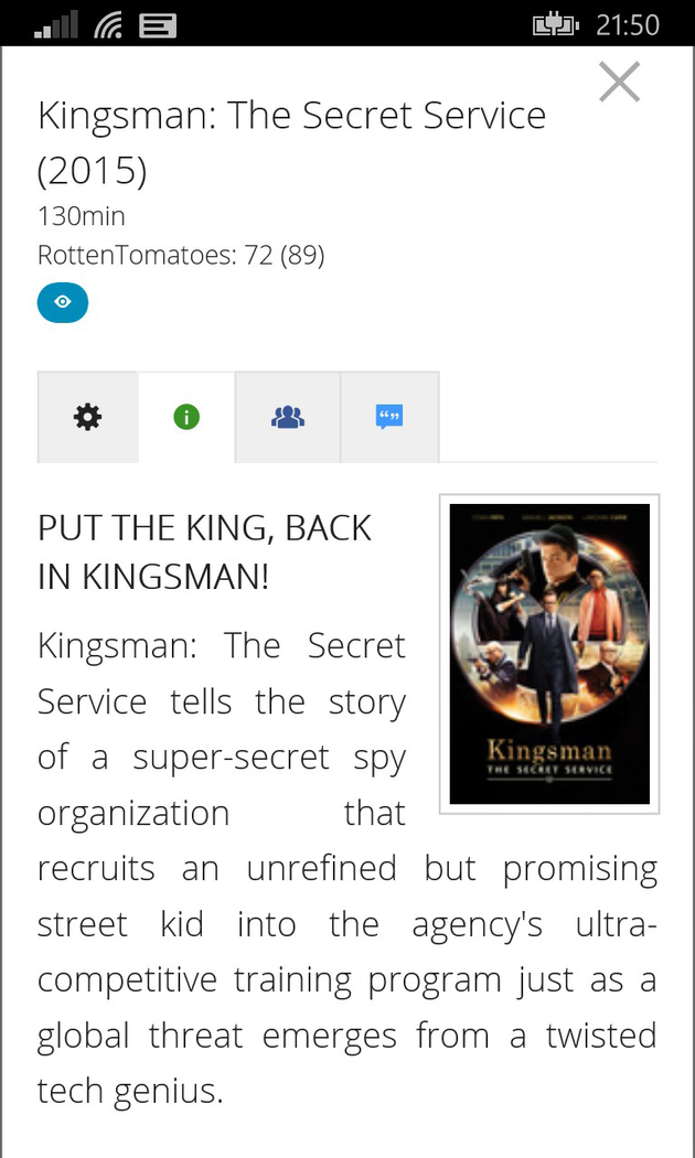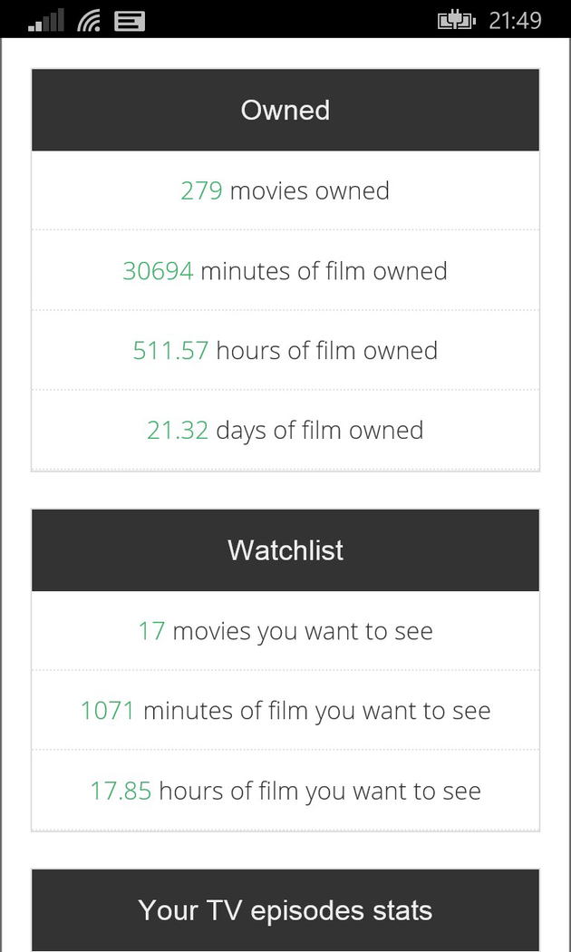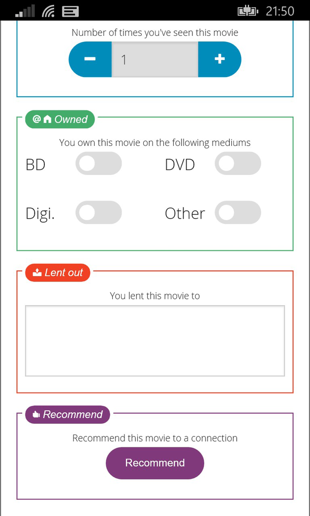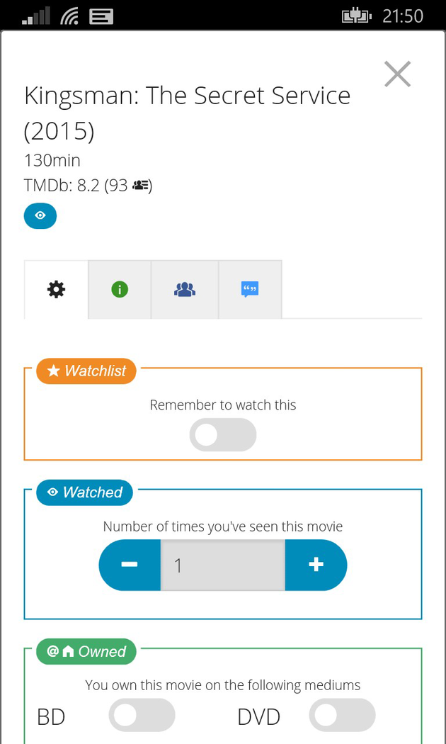 MovieSom is your own personal movie database. Add films to your watchlist so you don’t forget about them later on. Or recommend a film or TV series to your friends. Ever lost a DVD because you couldn’t remember who borrowed it from you? MovieSom keeps track of your entire collection and more. Much more. Like your personal statistics: how many times have you watched a movie and how much time have you spent watching movies altogether? Check it out, if you dare… MovieSom is multi-platform. It's even available as website so you can view, edit and take your personal settings anywhere you want. http://app.moviesom.com