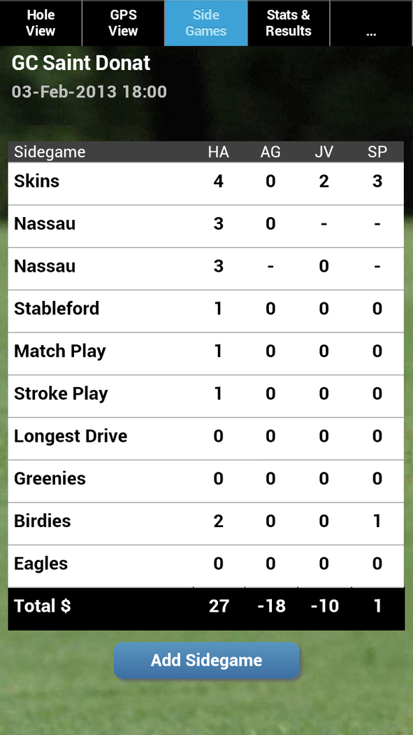 The ultimate golf scorecard, statistics and GPS application. mScorecard is the ultimate golf scorecard, statistics and GPS software on the market. It instantly calculates scores, handicaps, stableford points, sidegames, advanced round statistics and distances for up to five players. mScorecard allows you to: * Track strokes and putts along with fairway hits, greens in regulation, up-and-downs, sand saves and penalties for up to five players per round. Enter scores and shot details in a matter of seconds per hole. * Store full game histories and advanced round statistics on your phone along with an unlimited number of courses, players and rounds. Or post them on our server for detailed analysis. * Use GPS to view your distance to the green at all times. * Calculate and track your handicap index automatically based on played rounds. mScorecard™ supports multiple handicap systems in different countries. * Analyze rounds and statistics to manage and improve your game. * Wager and play popular side games, including Skins, Nassau, Match Play, Stroke Play, Stableford, Greenies, Longest Drive, Birdies, Eagles. * Share scorecards and stats with your friends via e-mail and Facebook