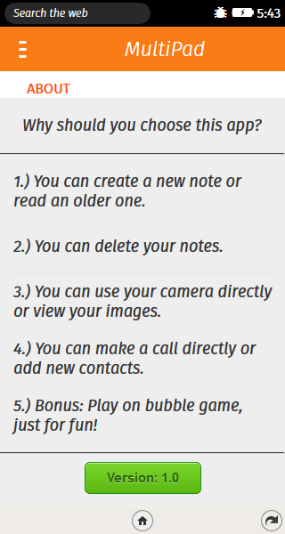 Create, read, delete notes, make a call, view gallery, use your camera or just play a bubble game.