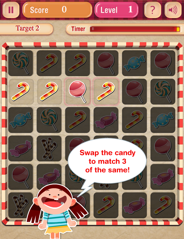 Match your favorite candies to win in this sweet Match Three game. Cavities not included.