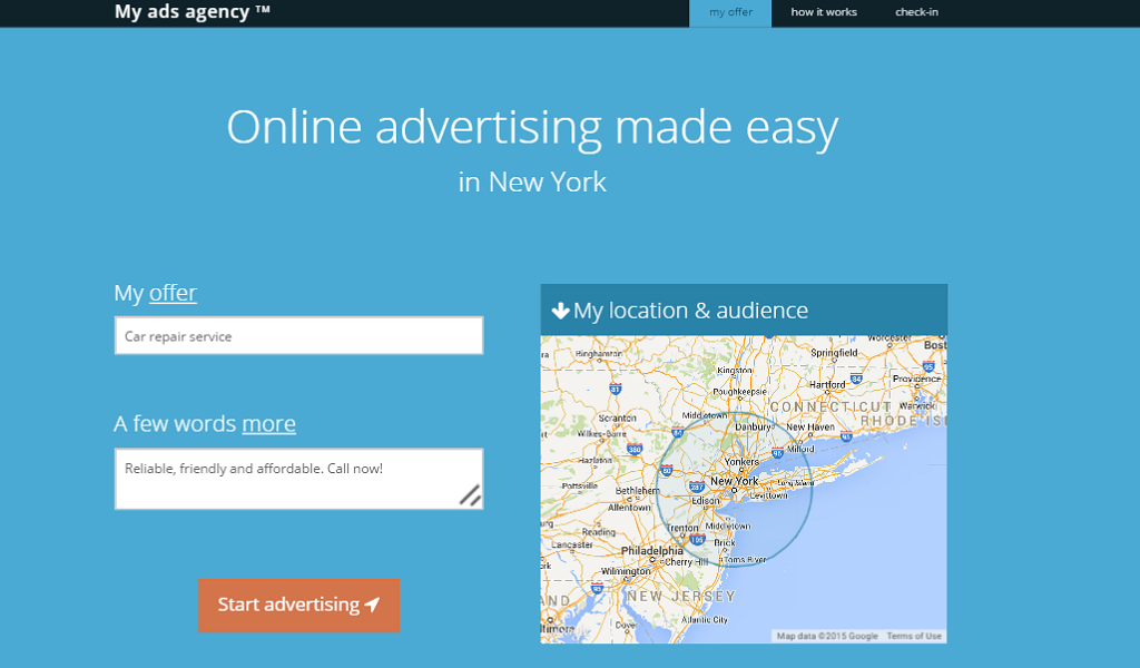 My Ads Agency - Your Personal Ad Agency Online Advertising Made Easy. Just a few clicks, and your offer hits the customers around your location. My Ads Agency is your self-serve ad agency on the Web. No upfront payment, no commitment. Get your sales back on track, start advertising today! MyAds.agency