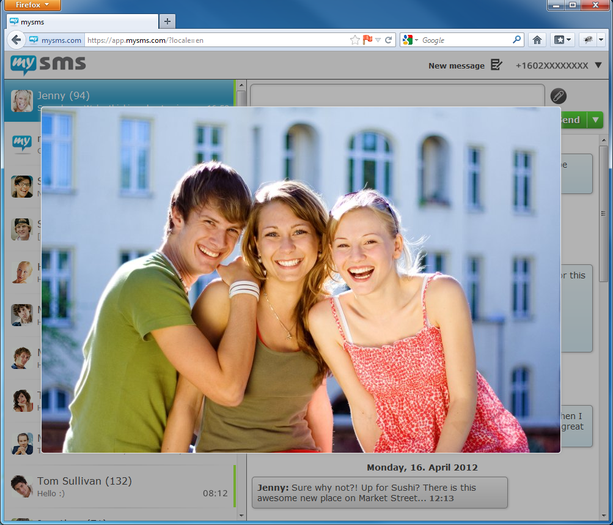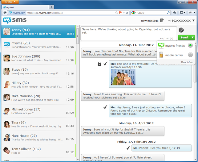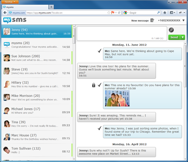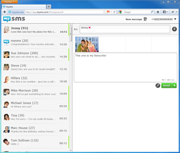 Send & receive all your texts on your Notebook, computer and tablet – just like on your smartphone. Send & receive all your messages on your notebook, computer and tablet – just like on your smartphone. Install mysms and you’ll be able to: ★ Send and receive messages on your computer ★ Automatically sync all the messages on your smartphone, tablet and computer ★ Text other mysms users for free PLEASE NOTE: This app is not self-contained. To be able to use mysms, you have to have mysms installed on your iPhone or Android smartphone. Just follow the following steps and you’ll be on your way: Step 1) Install mysms on your smartphone and register. Here’s the links: Google Play Store: https://play.google.com/store/apps/details?id=com.mysms.android.sms Apple App Store: http://itunes.apple.com/us/app/mysms-messenger/id533406258 Windows Marketplace: http://www.windowsphone.com/en-us/store/app/mysms/a0434c92-f931-4f40-8b94-85d78055db46 Step 2) Start the mysms Firefox application and log in using your number and password. Why you should be using mysms: ON YOUR SMARTPHONE AND ON THE WEB Send and receive messages on your computer just as you would on your smartphone. All of your messages are automatically kept in sync – that means that you can access them from any of your devices whenever you want. FREE TO FRIENDS If a contact also uses mysms, you can text each other for free using mysms friends. SEND TEXT MESSAGES REMOTELY (only for Android users) So you pay a flat rate for texting and you want to make use of this online? When you use mysms, you can text online via your network service provider…and there are no additional costs. ALERTS ON THE WEB After installing HTML Desktop Notifications https://addons.mozilla.org/en-US/firefox/addon/html-notifications, you will receive alerts in your browser AND on your smartphone. ****************** We’re always happy to hear from you! Do you have a suggestion? A question? A problem using the application? Just send an email to [email protected] and we’ll get back to you as quickly as possible. You can reach us on Facebook at www.facebook.com/mysms, on Twitter @mysms as well as on Google+ gplus.to/mysms