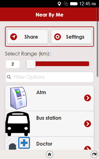 Now better UX than previous. Customize your home screen. Showing distance between current location and destination with results. This app is going to help people find ATM booths, filling stations, hospitals, restaurants, shopping complexes, mosques, schools, universities, fire services and etc in their nearest location. It will also show the direction from user's current location to the destination in detail via Google Map. Another core feature of this app is to broadcast current location via SMS, Email and social Medias. Let's say you are in a dangerous situation and you need rescue. Don't worry this app will broadcast your current location in all possible ways and you are saved.