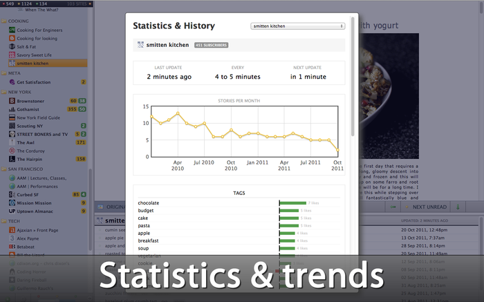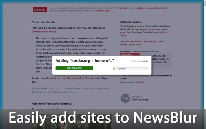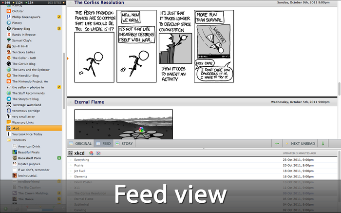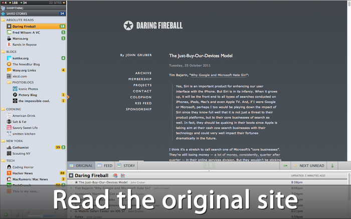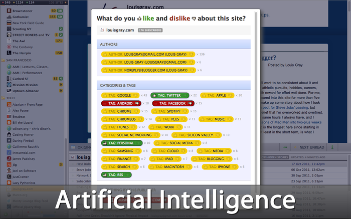 Visual RSS feed reader with intelligence. NewsBlur is like Google Reader, but it has three distinct advantages: 1) Shows the original site (you have to see it to believe it) 2) Hides stories you don't want to read based on tags, keywords, authors, etc. 3) Highlights stories you want to read, based on the same criteria. It's a very original take on RSS feed reading. It's also being built by a sole indie developer as open-source software: http://github.com/samuelclay. It's freemium, with premium accounts costing $12/year for unlimited feeds, faster updates, and access to future features like the iPhone app. NewsBlur supports sending to Instapaper, River of News, and many other standard RSS reader features. Feature requests are always welcomed. NewsBlur's sole developer is: http://twitter.com/samuelclay NewsBlur is at: http://www.newsblur.com