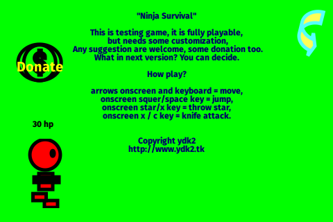 Simple ninja killer This is testing game, it is fully playable, but needs some customization, any suggestion are welcome, some donation too. What in next version? You can decide. How play? arrows onscreen and keyboard = move, onscreen squer/space key = jump, onscreen star/x key = throw star, onscreen x / c key = knife attack.