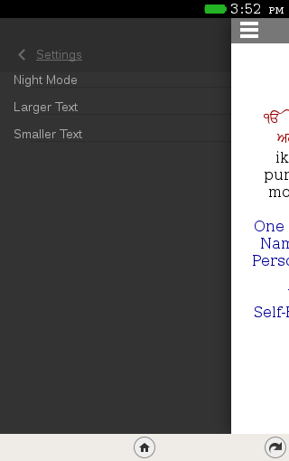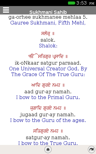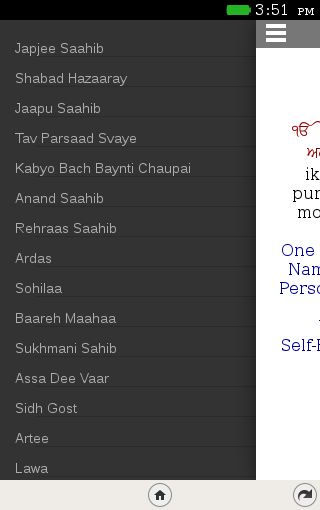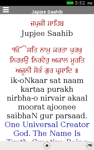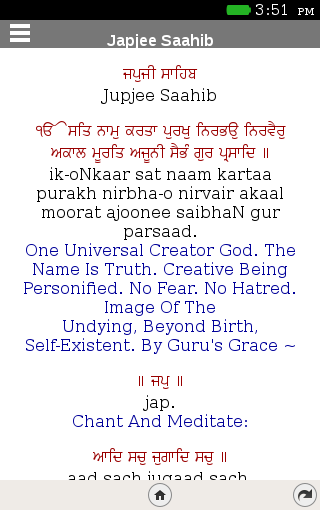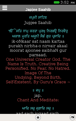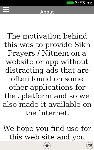 This is a simple, ad-free easy to use application that provides you with Nitnem Sikh Prayers in Gurmukhi (Punjabi), Romanized (Transliteration) and Translation texts. It locks the screen into portrat mode but you can choose to rotate it using the menu. The menu also lets you toggle night reading mode (black background that emits less light) and increase / decrease text size. So far, the following texts have been included: - Japjee Saahib (Japji Sahib) - Shabad Hazaaray (Shabad Hazare) - Jaapu Saahib (Jaap Sahib) - Tav Parsaad Svaye - Kabyo Bach Baynti Chaupai - Anand Saahib (Anand Sahib) - Rehraas Saahib (Rehras Sahib) - Ardas - Sohilaa (Sohila) - Baareh Maahaa - Sukhmani Sahib - Assa Dee Vaar (Asa Ki Vaar) - Sidh Gost - Artee - Lawa The motivation behind this application was to provide Sikh Prayers / Nitnem without ads which are very distracting and often found on other similar applications. This application is and always will be ad-free. I hope you find use for this application and you can advise for more changes by contacting me at [email protected] It should be noted that the source for these prayers came from the PDF files at http://www.gurbanifiles.org/pocket_pc/index.htm. These were converted into text format and parsed for viewing on the Android App. Many banis were sourced from http://fateh.sikhnet.com/s/DownloadBanis also and some required some modification for GRE (gurmukhi, roman, english) consistency. I have tried my best to duplicate the works on said website, but please do advise if there are any discrepancies and I will correct them as soon as possible. Also, if you wish to see other texts included in this, please also email me and I will try my best. Thank you for using this App!