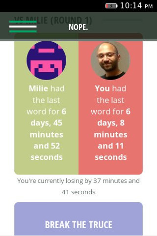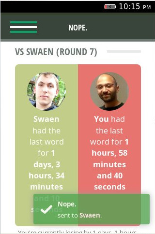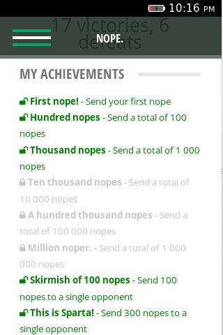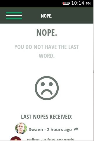 Nope is a tug of war social game. Send "nopes" until you get the last word! Compete with your friends to see who the most tenacious is! Act at the exact right timing and unlock achievements! Send hundreds, thousands of nopes, and become the greatest noper!