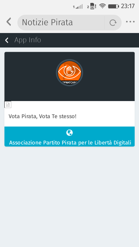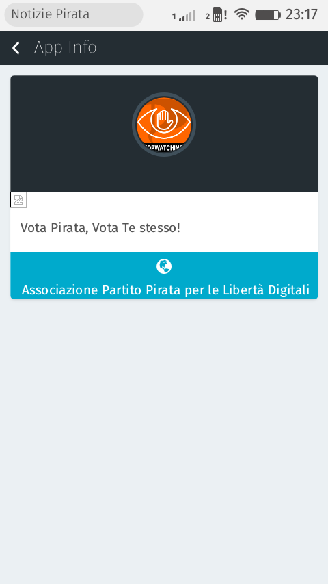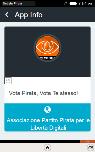 Questa è l'applicazione non ufficiale (per ora) del Partito Pirata italiano: verranno mostrate informazioni sul partito e notizie di politica, economia e società, che vengono pubblicate dalla pagina di Facebook. L'applicazione si basa su Apptuter, applicazione open source che permette di creare app facilmente.