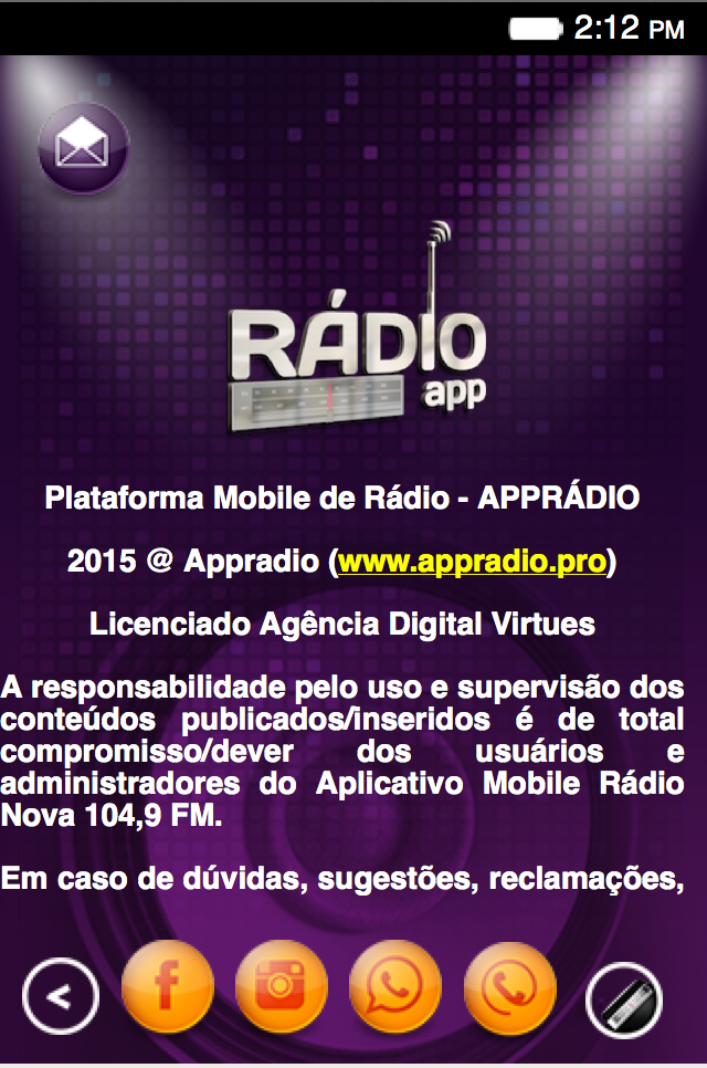Rádio FM A rádio Nova FM leva ao seus ouvintes a melhor programação através do seu aplicativo. Agora você pode ouvir a rádio em qualquer lugar do mundo 24 horas por dia. Não perca tempo, baixe o nosso aplicativo para você curtir a Nova FM de onde você estiver. Uma nova emoção no ar! Tags app , appradio radio , radio nova fm , fm , 106.9 fm , rádio brasileira, radios brasil,rádio brasileiro, musica , music , brazilian radio , brasil , brazil , music brazil.