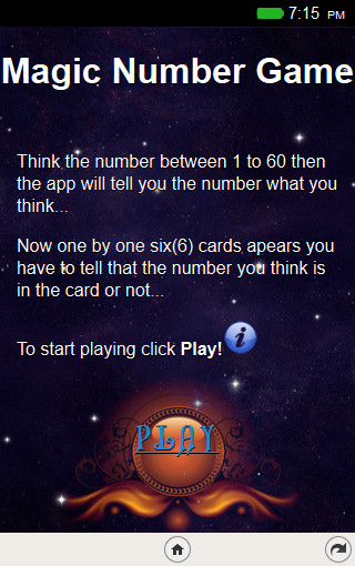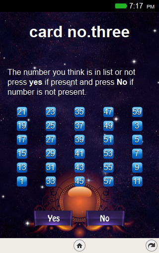 We give you surety that this App will read your mind. Number Illusion is a simple card game. It is a trick game and based on Maths logic. In this App you have to think number and then the App will tell you what number you think.