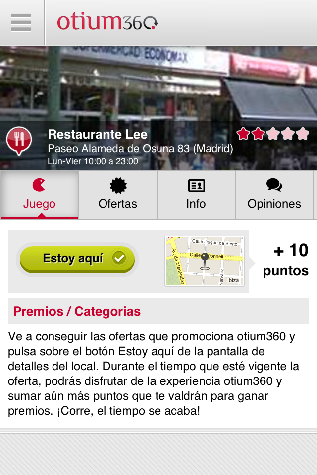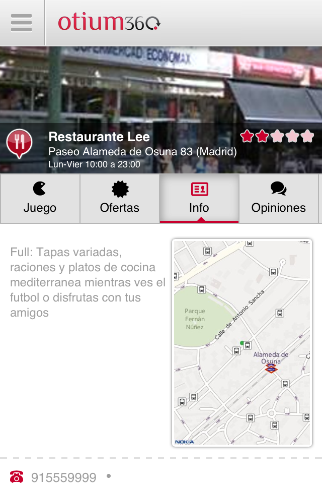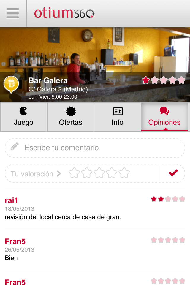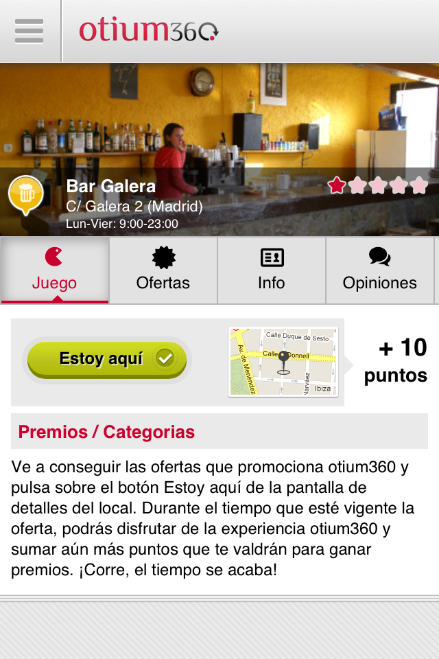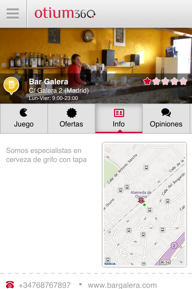¡otium360 es tu nueva compañera de ocio! Descárgatela gratuitamente y disfruta en la palma de tu mano de todo el ocio de tu ciudad. No te preocupes por buscar en una base de datos inmensa, simplemente créate un perfil lo más fiel a tus costumbres de ocio y otium360 hará el resto haciéndote llegar ofertas y promociones de tus sitios favoritos. Bien a tu alrededor o bien en las zonas que selecciones como “favoritas”. ¿Te apetece cenar con tus amigos y no sabes dónde? ¿Quieres sorprender a tu pareja con un lugar encantador? ¿Qué tal un café o un chocolate para reponer fuerzas? ¿Echas de menos la comida casera? ¿Te apetece descubrir nuevos lugares con un encanto especial? ¡Con otium360 todo esto y más en la palma de tu mano! Y eso no es todo, cuando llegues a un establecimiento asociado posiciónate con el botón “Estoy aquí” y suma puntos que te ayudaran a conseguir fantásticos premios; participa en “La Movida Otium” y disfruta de una tarde/noche distinta..; y dentro de poco… diseña tus rutas de ocio o sigue las rutas creadas; recomiéndanos tus lugares para que los añadamos a otium360; sube fotos en tus lugares de ocio… y muchas sorpresas más. De momento estamos trabajando en Madrid, pero poco a poco iremos ampliando nuestro servicio a otras ciudades… A qué esperas para sacarle el máximo partido a tu ocio… otium360 ya está listo. ¿Y tú?
