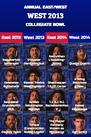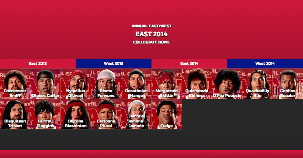 Key and Peele's East/West College Bowl soundboard. Hear the player introductions for each of the annual East/West College Bowl line-ups. Keep your eyes peeled for rising stars such as Ozamataz Buckshank and Hingle McCringleberry, and check out this year's projected rookies-of-the-year, Bismo Funyuns and Quackadilly Blip. Try it out at http://ozamataz.ngokevin.com Source Code