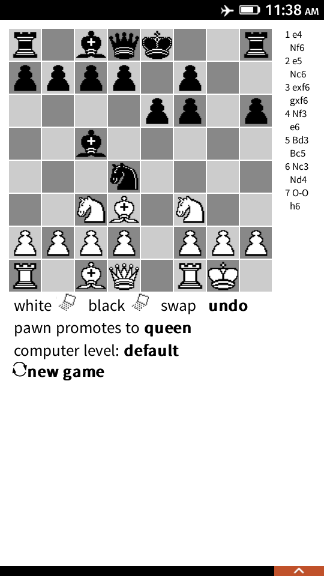 p4wn - Chess with offline feature Keywords Chess, Schach, Ajedrez, Échecs, Computer Chess p4wn is quite small, plays Chess well enough to be interesting on your Firefox OS device. P4wn is completely free, available under CC0 or public domain terms, or as close to it as various laws allow. No warranty; no restrictions. You can use it for anything you want. Looking for an Android version? Just visit the Homepage and search for the APK releases. These people in alphabetical order by last name (and probably others whose names are forgotten) have added something to p4wn: Douglas Bagnall, Chris Lear, Antony Lesuisse, Oliver Merkel, Sven Vahar, Ron Winter, Ivan Yelizariev