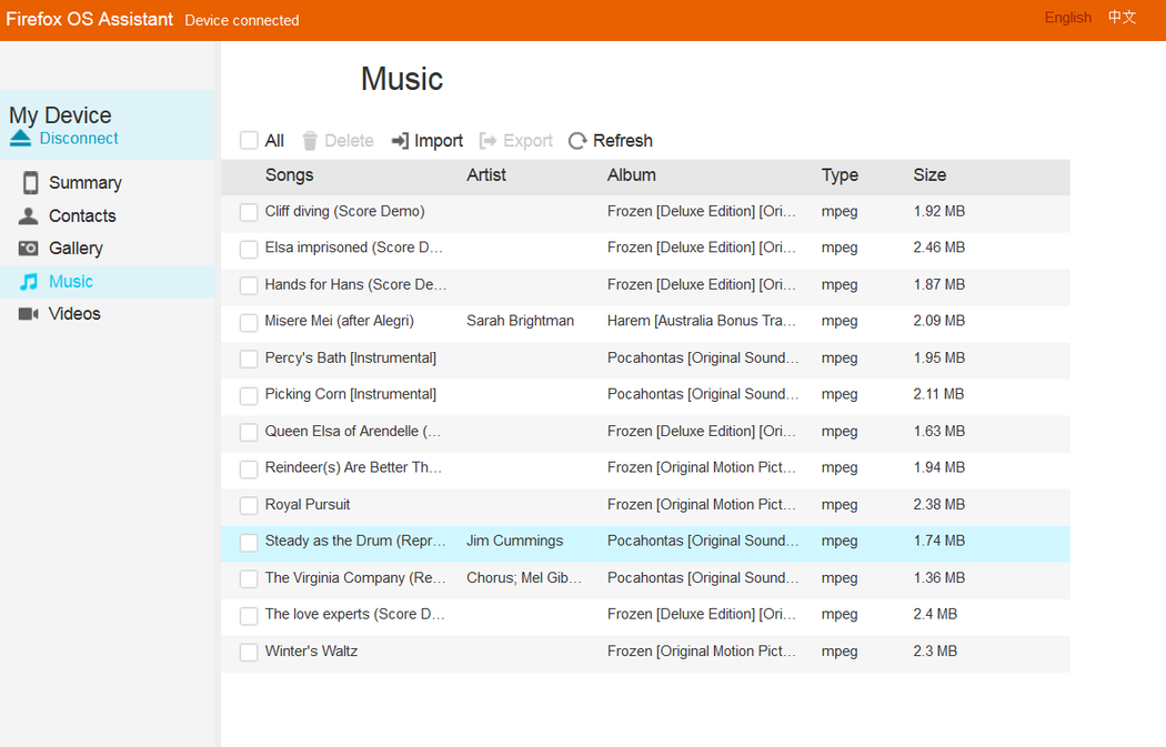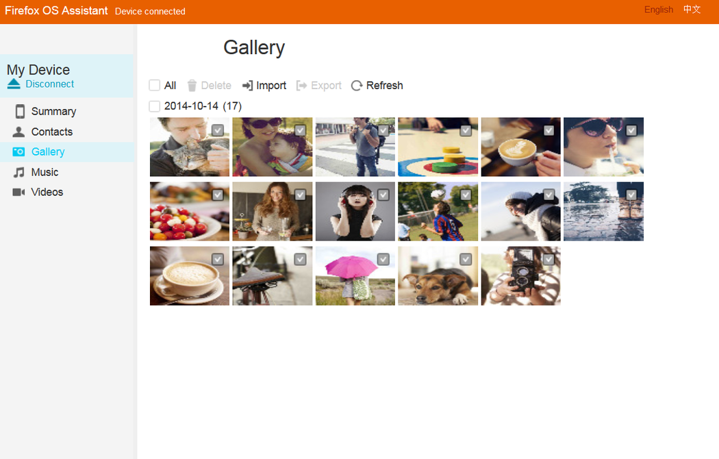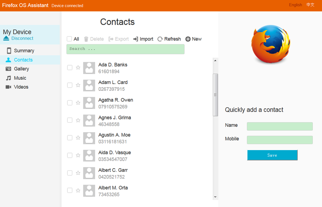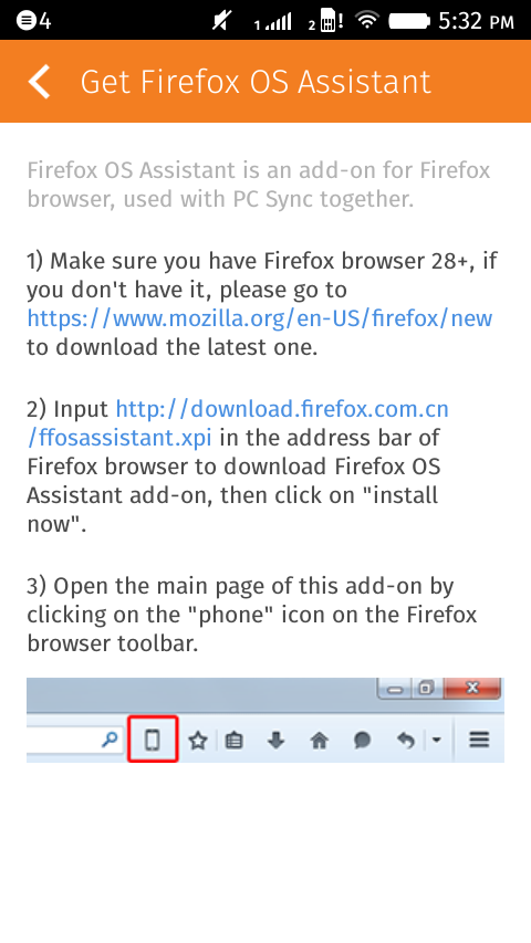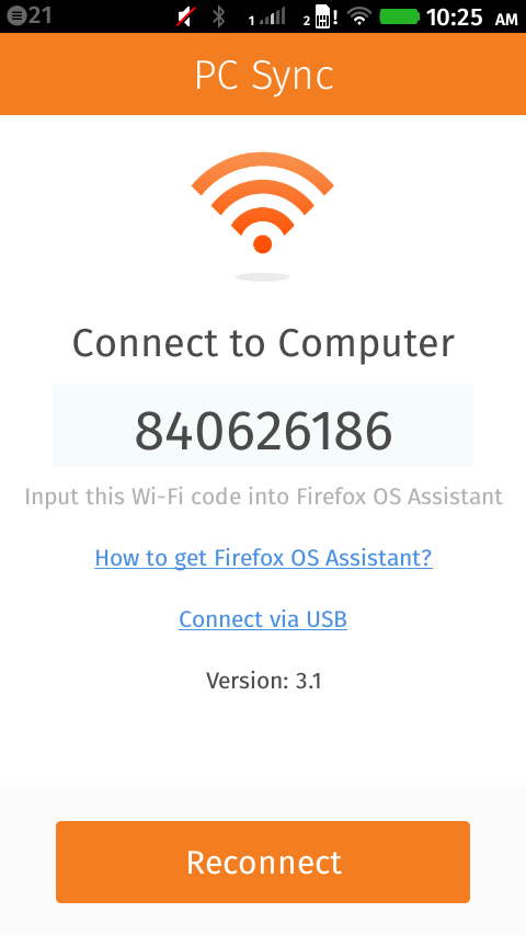 PC Sync is a light utility that allows you to manage your Firefox OS device from Firefox desktop browser via Wi-Fi or USB connection.The data transmission is only between mobile device and your computer. You are able to manage the contacts, photos, music and videos stored on your Firefox OS device easily. ****** Supported Version ****** Firefox OS v1.3+ Firefox browser v28.0+ Firefox OS Assistant v2.1.0+ In addition to installing the app on your Firefox OS device, you also need to install the Firefox OS Assistant add-on onto Firefox desktop browser. Please make sure you have the latest version of PC Sync app and Firefox OS Assistant add-on. Please find the add-on at http://download.firefox.com.cn/ffosassistant.xpi