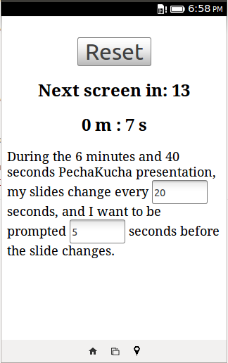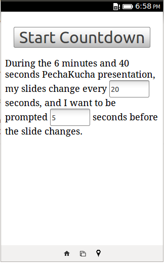 A discreet prompter for PechaKucha presentations. This application will make your device vibrate to indicate when your slide is about to automatically change. Simply set the slide duration (default 20 seconds), and the number of seconds to be prompted before the slide change. Disclaimer: This application requires your device to have a vibrate motor, and for that feature to be switched on. The length of the vibration is timed at half a second. The developer accepts no responsibility if this application is responsible for shortening life of your device's vibrate motor.