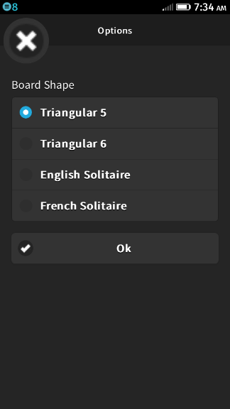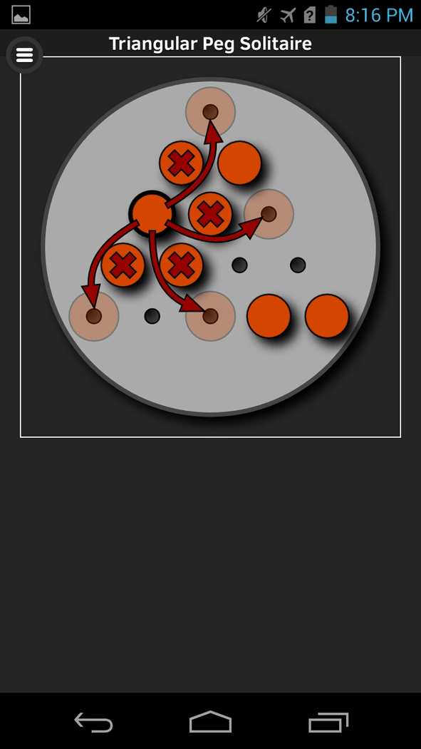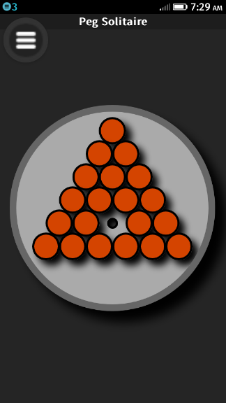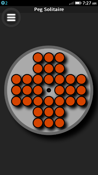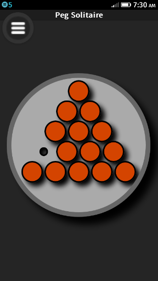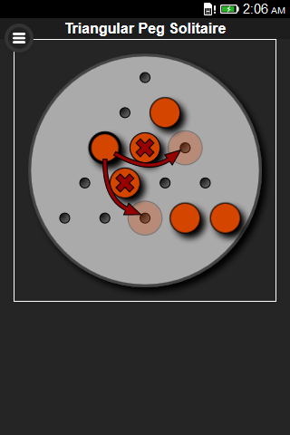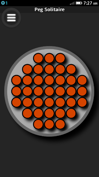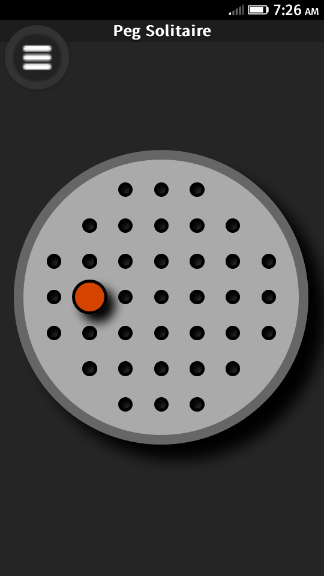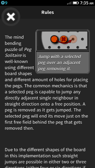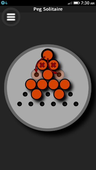 The mind bending puzzle of Peg Solitaire is well-known using different board shapes and different amount of holes for placing the pegs. The common mechanics is that a selected peg is capable to jump any directly adjacent single neighbour in straight direction onto a free position. A peg is removed as it gets jumped. The selected peg will end its move just on the first free field behind the peg that gets removed then.