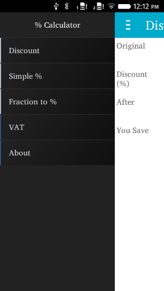 % calculator is useful for the following : ================================== Everyday calculations - Simple Percentage - Discount - VAT - Fraction to % Real-life situations: - Shopping (discounts, VAT)