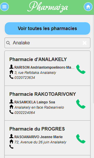 Pharmaiza vous indique les contacts (adresse et numéro de téléphone) des pharmacies à Tana. Vous pouvez ainsi appeler directement une pharmacie de votre choix. Avec Pharmaiza, rechercher et contacter une pharmacie devient un jeu d'enfant. L'application étant disponible à la consultation à tout moment, vous pouvez retrouver une pharmacie instantanément. De plus, Pharmaiza vous aide à localiser les pharmacies dans un rayon proche. #AppOrangeKlifChallenge