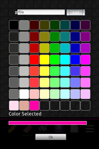 App for paint in pixel art for Firefox Os. Particularity of app: 1- Paint in pixel art. 2- Custom colors with rgb value. 3- Saves file for edit. 4- Saves file in png format.