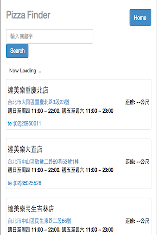 Find you Pizza nearby you at Taiwan. ( This web app is for Taiwan users) if you are interested in my applications. you can also have a visit by using following link: http://studiobinghuan.blogspot.com/?view=flipcard You can also open the web app directly by following link: http://binghuan.herokuapp.com/pizzaFinder.html