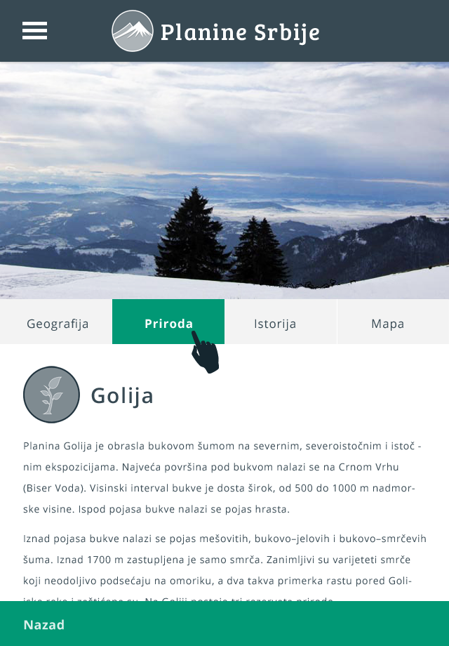 "Mt guide Serbia" is a guide through: geography, history and natural beauties of Serbian mountains and countryside. App is currently supporting only Serbian language, but we are working on English translations!