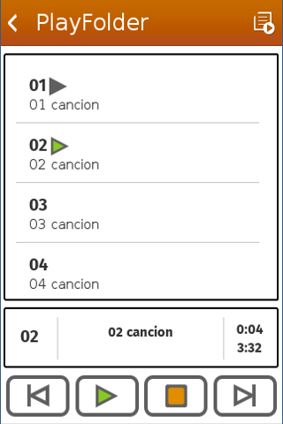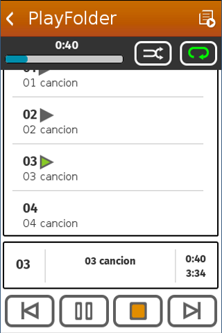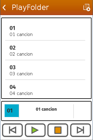 Classic style mp3 player. It searches the folders with mp3 or ogg archives and shows them in a list. You can search them within the SDCARD or just within a specific folder. Once you tap on the desired folder, it adds all the songs to be played. Reproductor Mp3 al estilo clásico. Busca las carpetas con mp3 o ogg y te las muestra en una lista. Puedes buscar en toda la SDCARD o dentro de una carpeta en concreto. Al tocar en la carpeta que quieras te agrega todas las canciones para ser reproducidas.