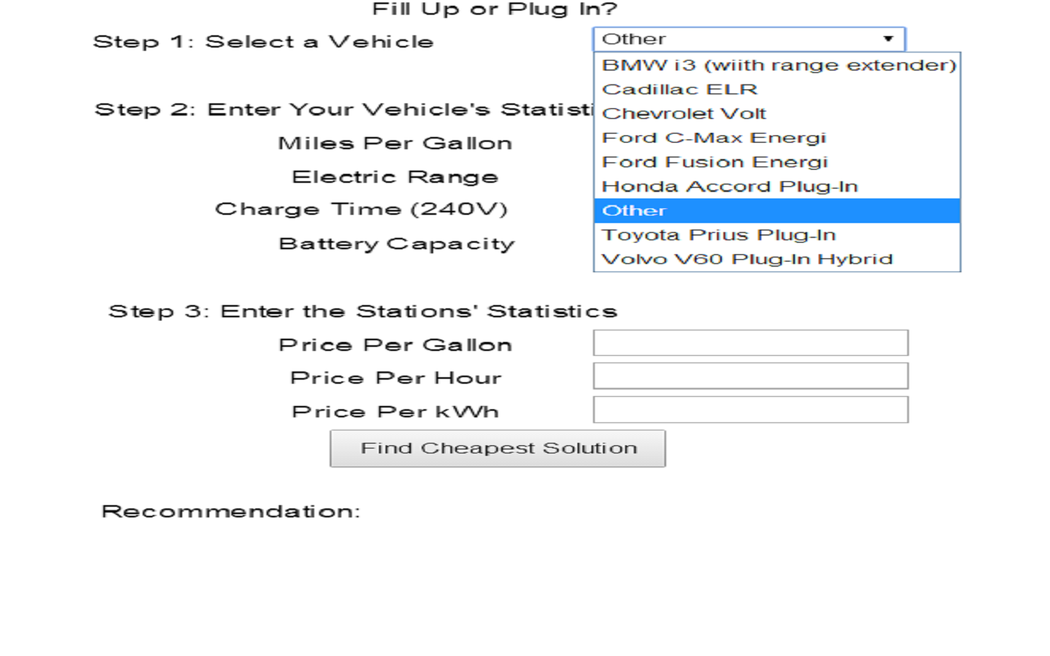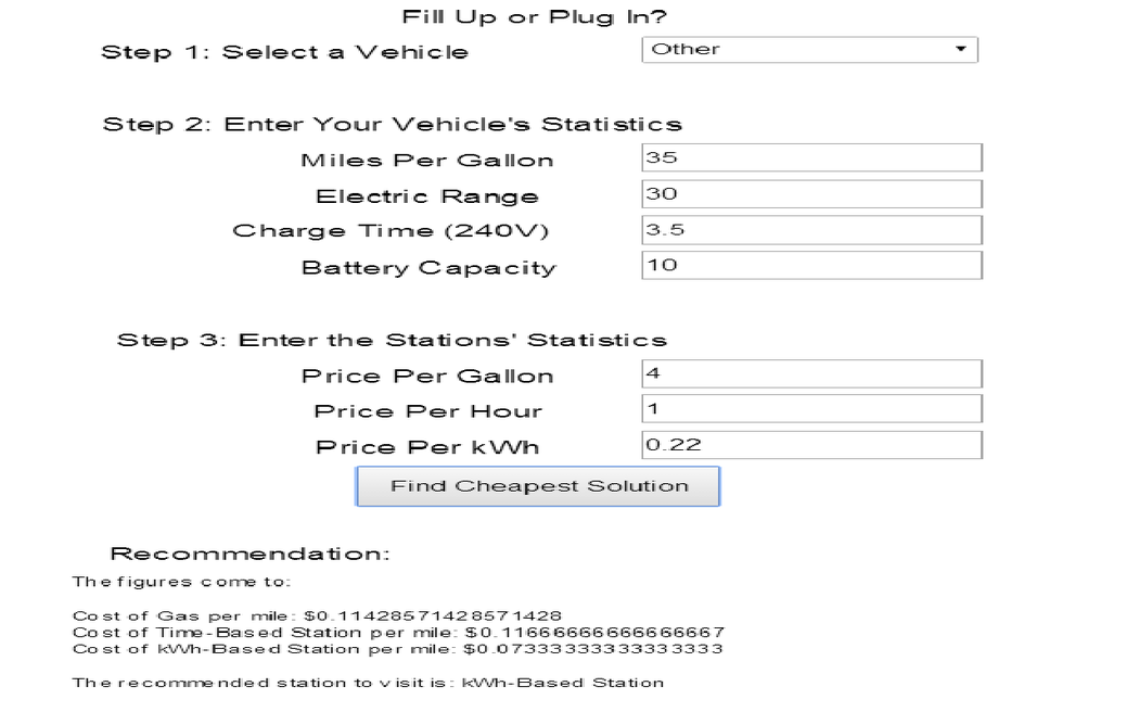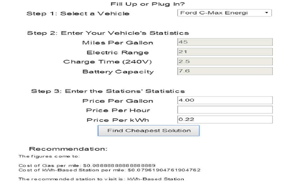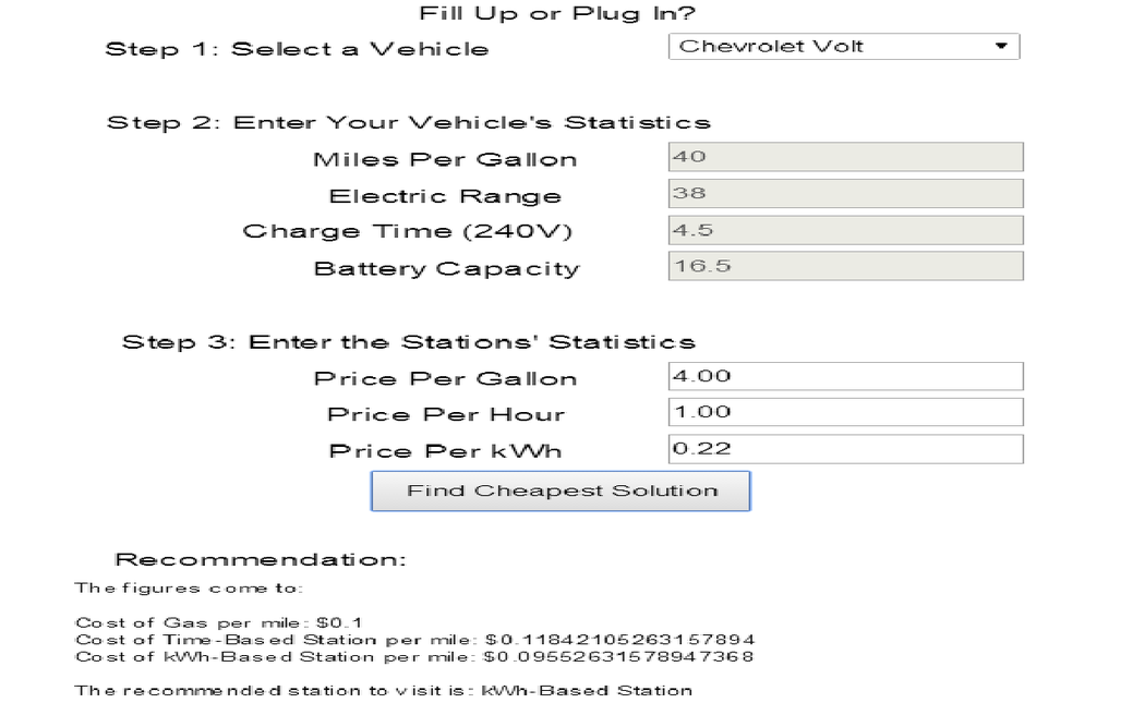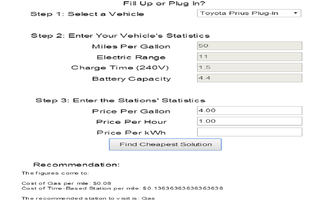 Own a plug-in hybrid car? Wonder if that paid charge station is a better deal than the gas station across the street? Then this app can help! Simply tell it the car you have and the prices of each and it will make a recommendation based on the price per mile. Not to worry, no personal data is stored or transmitted.