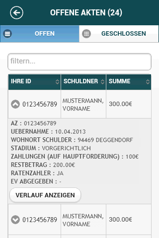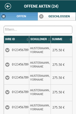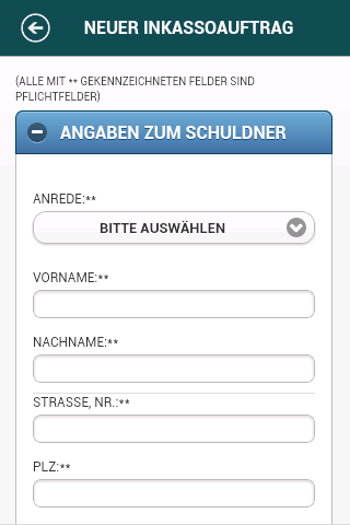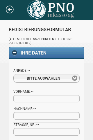 PNO inkasso APP Einfache Inkasso-Übergabe und volle Transparenz zur Bearbeitung am Tablet oder Smartphone. Die kostenlose PNO inkasso APP bietet Unternehmen, Einzelfirmen und Privatpersonen die Möglichkeit, ihr eigenes Mahnwesen um die Dienstleistungen der PNO inkasso AG zu erweitern. Ganz einfach können über das Auftragsformular Einzelforderungen, aber auch mehrere offene Posten zum Inkasso übergeben werden. Rund um die Uhr und stets tagesaktuell kann in dieser Anwendung danach der Bearbeitungsstand von übermittelten Fällen in der „Aktenübersicht“ verfolgt werden. PNO inkasso bietet eine KOMPLETTLÖSUNG FÜR DAS FORDERUNGSMANAGEMENT: - vorgerichtliches Inkasso inkl. Telefoninkasso - gerichtliches Mahnverfahren mit Mahnbescheid und Vollstreckungsbescheid - nachgerichtliche Maßnahmen: Zwangsvollstreckung, Pfändung, etc. - Überwachung von erwirkten Titeln(30 Jahre lang) Die PNO inkasso AG ist ein SERIÖSER PARTNER für das Forderungsmanagement: - Zugelassenes Inkassounternehmen durch den Präsidenten des Landgerichts Deggendorf - Eingetragen im Rechtsdienstleistungsregister mit AZ: 371E-DEG-07 - Mitglied im Bundesverband Deutscher Inkassounternehmen (BDIU) - Vertragspartner von SCHUFA, Bürgel und Arvato infoscore Absolut FAIRE KONDITIONEN machen die PNO inkasso APP zu einem attraktiven Angebot: - Kein Mitgliedsbeitrag - Keine Jahresgebühr - Keine Nicht-Erfolgs-Pauschalen - Nur die Auslagen (Mahnbescheid, Vollstreckung) werden weiterberechnet - 100% Auszahlung bei erfolgreichem Abschluss Neue Funktionen - Sichere Sitzungsverwaltung - Traffic- und ressourcenoptimierte Implementierung für die Darstellung Ihrer Akten - Verwendung modernster Webtechnologien (CSS3, HTML5, Javascript) - Geräteunabhängige (responsive) Umsetzung des Layouts für eine optimale Darstellung in Ihrem Gerät - Schnelle Erfassungsmöglichkeiten der Daten durch intuitive Eingabefelder - Unterstützung der Spracheingabe (Speech-to-Text) zur Filterung Ihrer Akten - Effiziente Speichernutzung inkl. intelligentem Loginbereich Die PNO inkasso APP ist ein Angebot der PNO inkasso AG, Brunnwiesenstr. 4, 94469 Deggendorf.